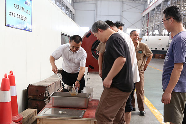 車間現場,周一飛、陳國良一邊分發冷飲,一邊與員工們親切交談,囑咐他們要注意防暑降溫,并對員工們不懼酷暑、勇戰高溫的奮斗精神、奉獻精神給予了高度贊賞。