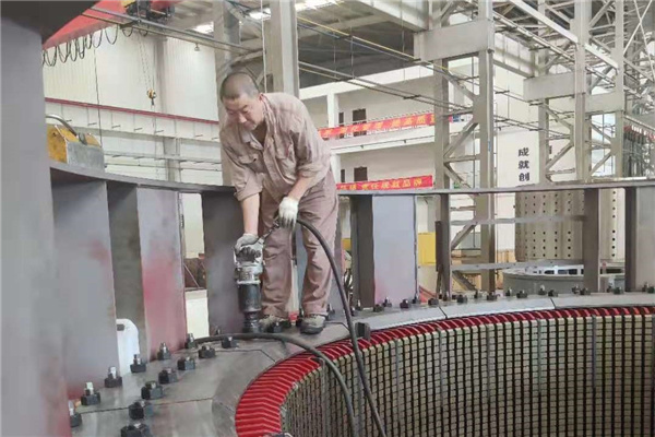 LK機組是公司重點項目,也是金裝車間目前在制主要水電產品。在2#機定子鐵芯的壓錠階段,為確保產出要求,裝配人員徐云強、謝二勝等在沖片到位后,放棄休息時間,克服高溫利用晚上加班加點。