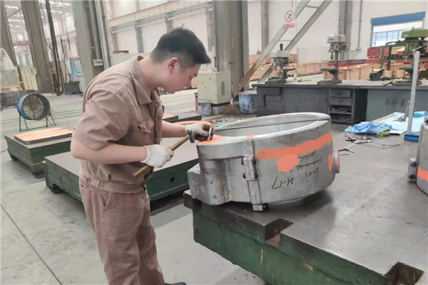 走到車間的另一角,劃線鉗工黨員葛炯曉同志,正在對工作令2021-17烏蘇市四棵樹項目的進油罩劃線。劃線工作能夠明確表示出加工余量以及加工位置,作為加工安裝工件的依據(jù)。只見他耐心細心、有條不紊地進行著手里的工作,最終高質高效地完成了任務,為是后續(xù)金加工工作提供了可靠的保障。